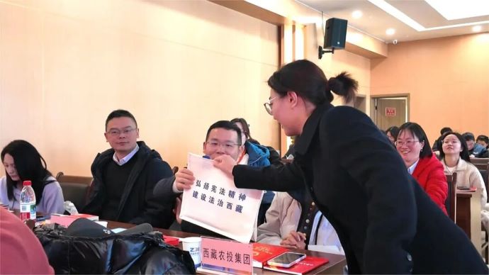 活動(dòng)現(xiàn)場(chǎng),一系列內(nèi)容豐富、形式新穎的環(huán)節(jié)有序開(kāi)展。參會(huì)人員集中觀看了憲法精神主題影片及“憲法進(jìn)企業(yè)”主題紀(jì)錄片,直觀感受憲法的崇高權(quán)威與實(shí)踐力量;活動(dòng)特邀西藏歐珠律師事務(wù)所律師歐珠永青作《憲法》專題講座,深入淺出解讀憲法核心要義與依法治企實(shí)踐路徑,充分闡釋了新時(shí)代《憲法》的新發(fā)展,引發(fā)廣泛共鳴;憲法趣味有獎(jiǎng)問(wèn)答互動(dòng)環(huán)節(jié)氛圍熱烈,有效調(diào)動(dòng)了干部職工學(xué)法用法的積極性;活動(dòng)還設(shè)置了現(xiàn)場(chǎng)法律咨詢環(huán)節(jié),幫助干部職工解決工作生活中遇到的法律問(wèn)題,號(hào)召大家爭(zhēng)做“學(xué)法先鋒、守法模范、用法表率”。