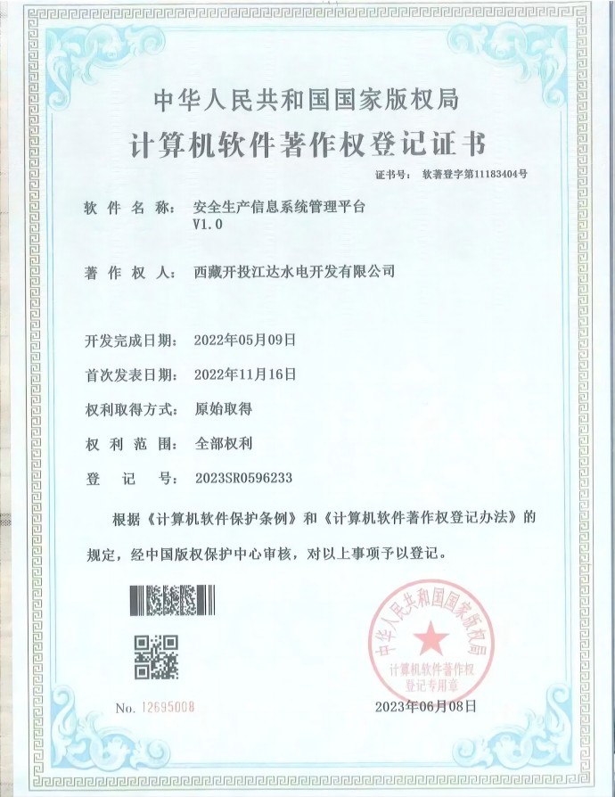 近日,經(jīng)中國(guó)版權(quán)保護(hù)中心審核,集團(tuán)公司所屬項(xiàng)目公司申報(bào)的三項(xiàng)軟件著作權(quán)符合《計(jì)算機(jī)軟件保護(hù)條例》和《計(jì)算機(jī)軟件著作權(quán)登記辦法》的相關(guān)規(guī)定,被正式授予計(jì)算機(jī)軟件著作權(quán)登記證書(shū)。本次取得證書(shū)的3項(xiàng)軟件分別是“安全生產(chǎn)信息系統(tǒng)管理平臺(tái)V1.0”“電子檔案信息化管理系統(tǒng)V1.0”“水電工程征地移民安置檔案信息管理系統(tǒng)V1.0”。