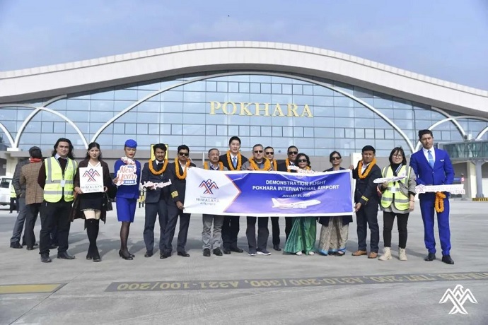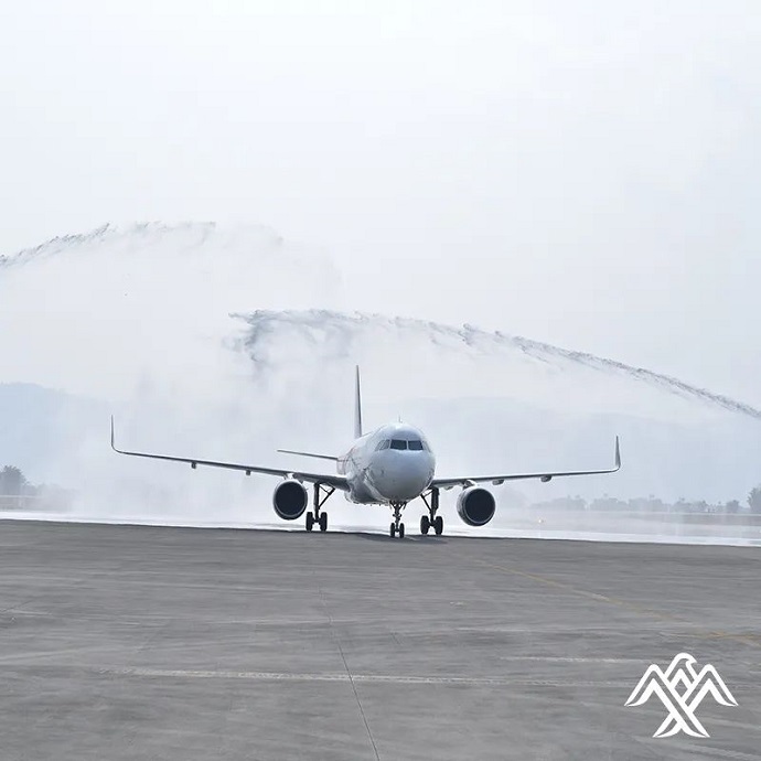首次亮相在博卡拉國(guó)際機(jī)場(chǎng)的喜航客機(jī),穿過(guò)象征民航最高禮儀的“水門”,受到隆重歡迎。此架飛機(jī)隨后于15時(shí)44分起飛,于16時(shí)17分返回加德滿都。