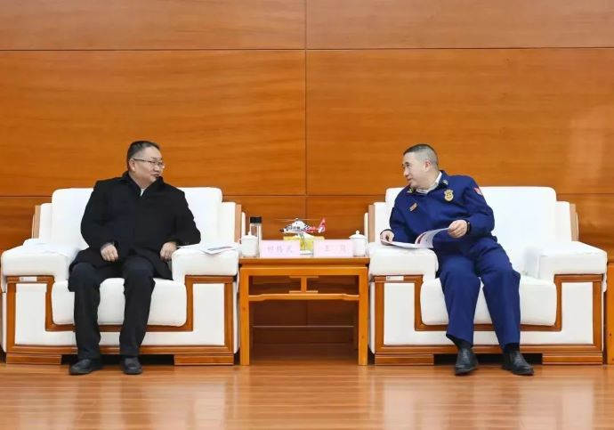 (祁騰武與區(qū)消防救援總隊總隊長王崗開展座談 松贊攝)