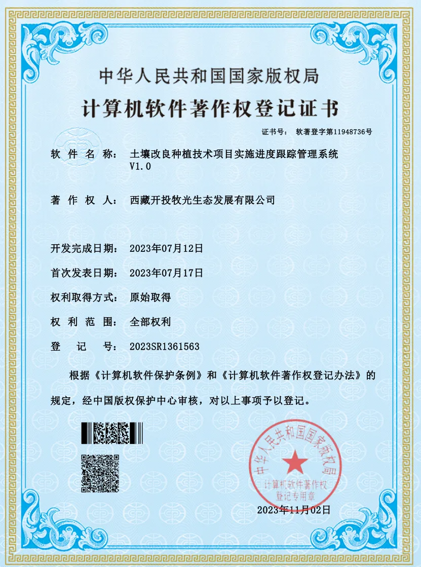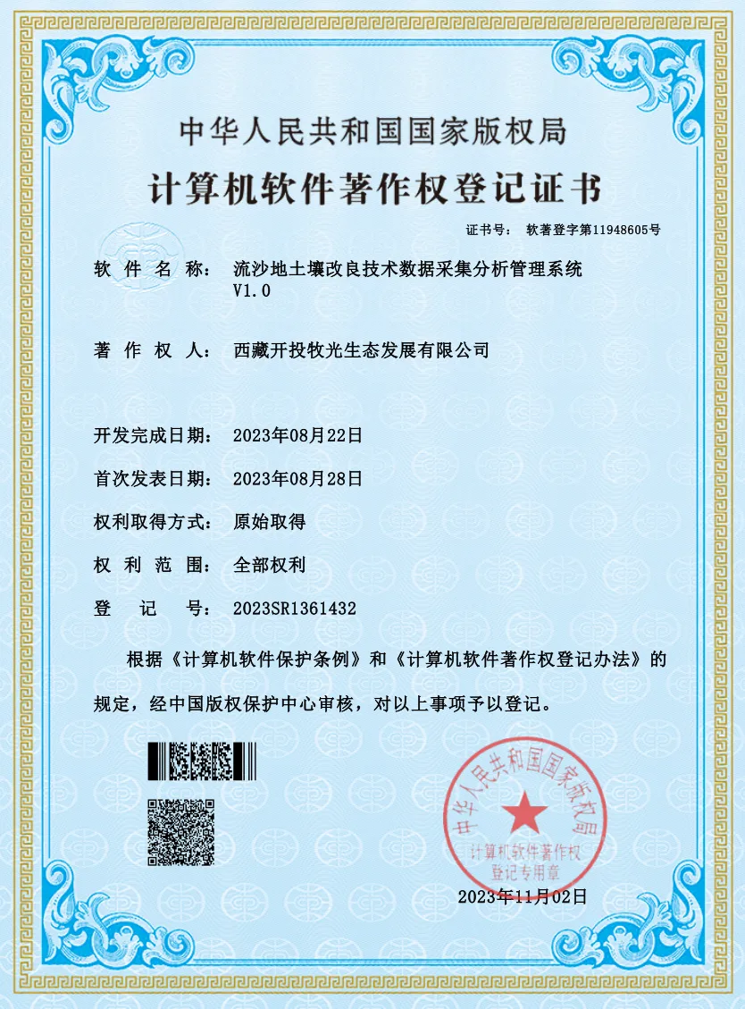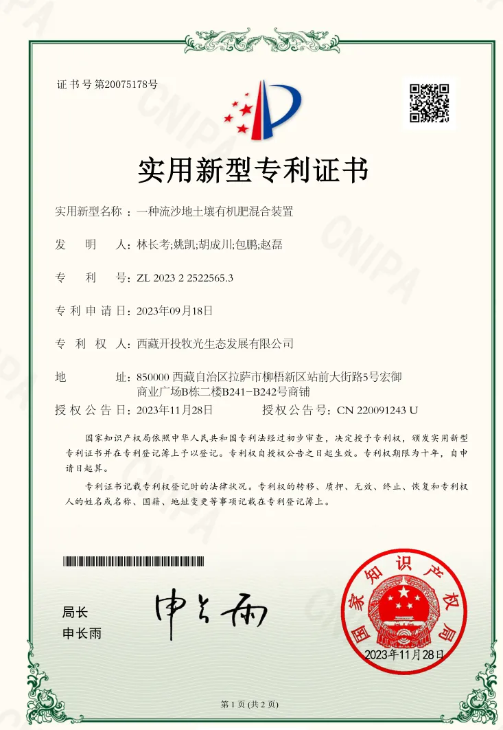 經(jīng)過一年多的摸索,西藏開投在拉薩南北山綠化工程項目形成了豐富的技術(shù)成果,于近日成功申報獲取了1項實用新型專利和5項計算機(jī)軟件著作權(quán)。分別是《一種流沙地土壤有機(jī)肥混合裝置》實用新型專利和《土壤改良種植技術(shù)項目實施進(jìn)度跟蹤管理系統(tǒng)V1.0》《流沙地土壤改良技術(shù)數(shù)據(jù)采集分析管理系統(tǒng)V1.0》《流沙地土壤改良農(nóng)業(yè)資源調(diào)度管理軟件V1.0》《荒山種植噴灌施工計劃數(shù)字化管理系統(tǒng)V1.0》《荒山種植噴灌施工智能化控制管理軟件V1.0》計算機(jī)軟件著作權(quán)。