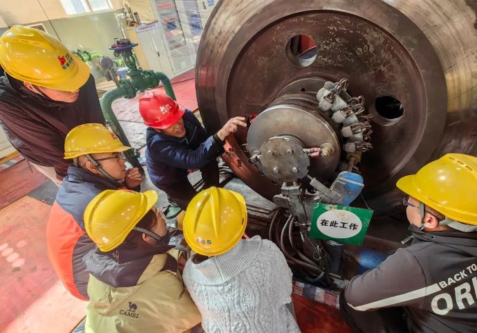 新員工在檢修現(xiàn)場了解水輪發(fā)電機組系統(tǒng)布置。