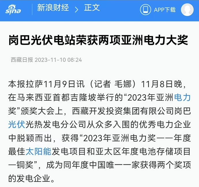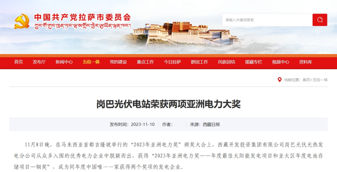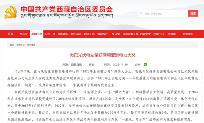 科技日報、西藏日報、西藏日報客戶端等多個媒體報道了《西藏開發(fā)投資集團有限公司崗巴光伏電站榮獲2023年度兩項亞洲電力大獎》