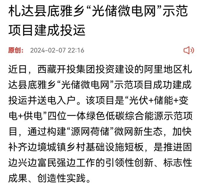 編者按:2月7日,西藏日報發(fā)表《札達縣底雅鄉(xiāng)“光儲微電網(wǎng)”示范項目建成投運》文章。全文如下: