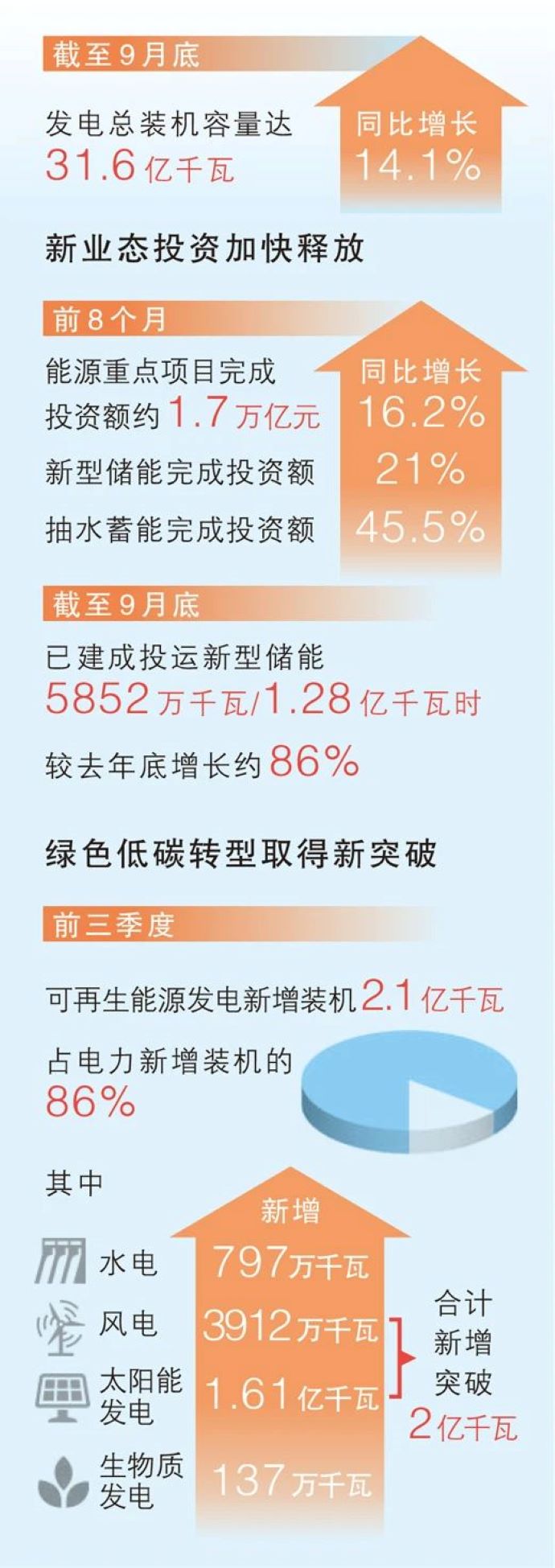 今年以來,我國能源綠色低碳轉(zhuǎn)型不斷取得新突破。前三季度,全國可再生能源發(fā)電新增裝機(jī)2.1億千瓦,同比增長21%,占電力新增裝機(jī)的86%。其中,水電新增797萬千瓦,風(fēng)電新增3912萬千瓦,太陽能發(fā)電新增1.61億千瓦,生物質(zhì)發(fā)電新增137萬千瓦,風(fēng)電太陽能發(fā)電合計(jì)新增突破2億千瓦。截至9月底,全國可再生能源裝機(jī)達(dá)到17.3億千瓦,同比增長25%,約占我國總裝機(jī)的54.7%。