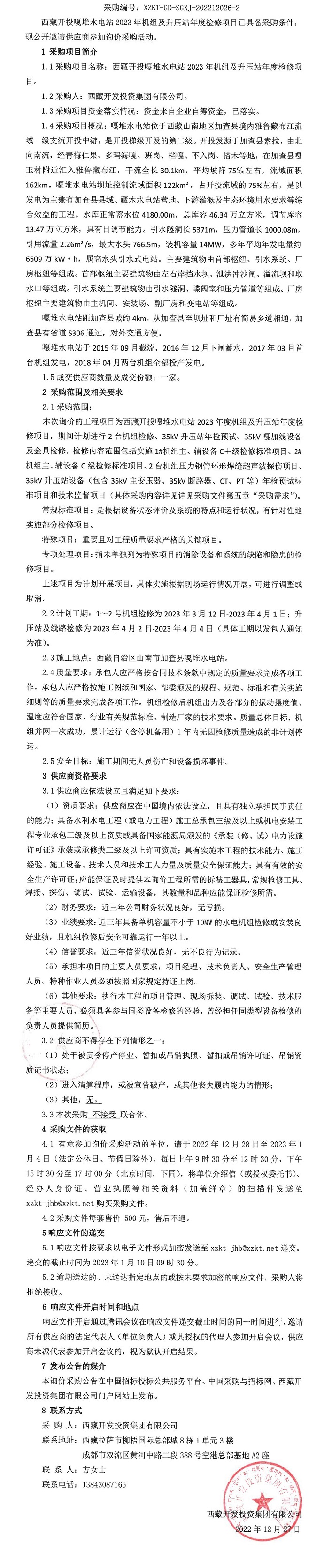 西藏開投嘎堆水電站2023年機組及升壓站年度檢修項目詢價采購二次公告