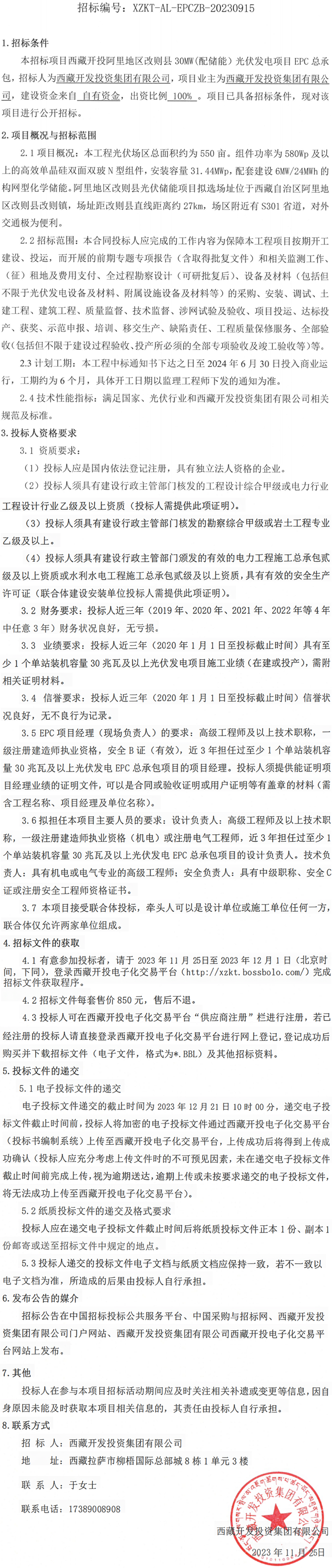 西藏開(kāi)投阿里地區(qū)改則縣30MW(配儲(chǔ)能)光伏發(fā)電項(xiàng)目EPC總承包招標(biāo)公告