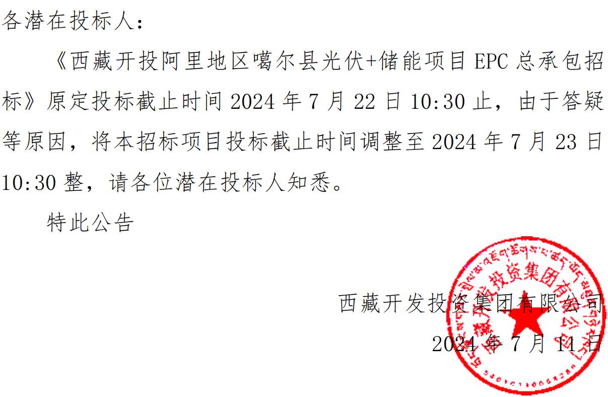 關(guān)于延長《西藏開投阿里地區(qū)噶爾縣光伏+儲能項目EPC總承包招標》投標截止時間的公告