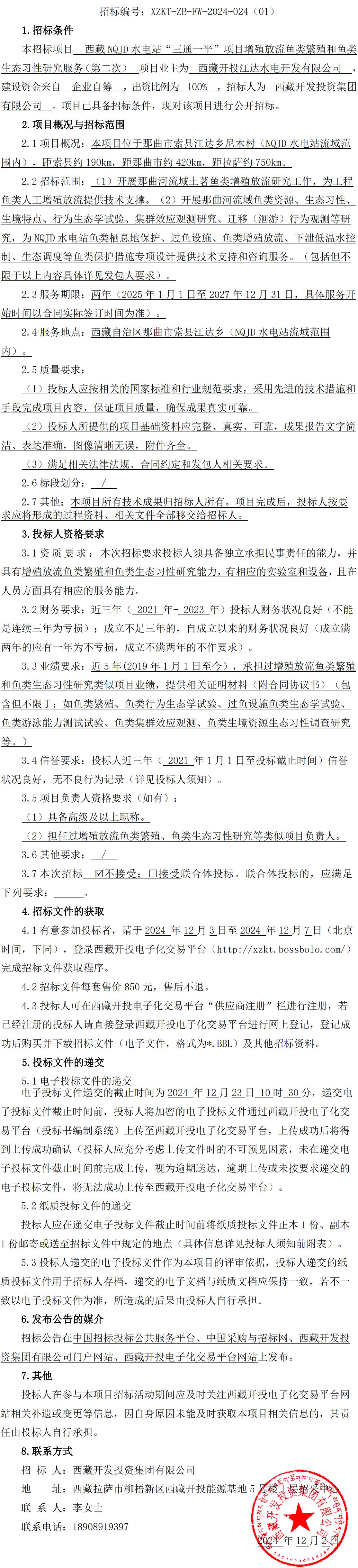 西藏 NQJD 水電站“三通一平”項目增殖放流魚類繁殖和魚類生態(tài)習性研究服務(第二次)招標公告