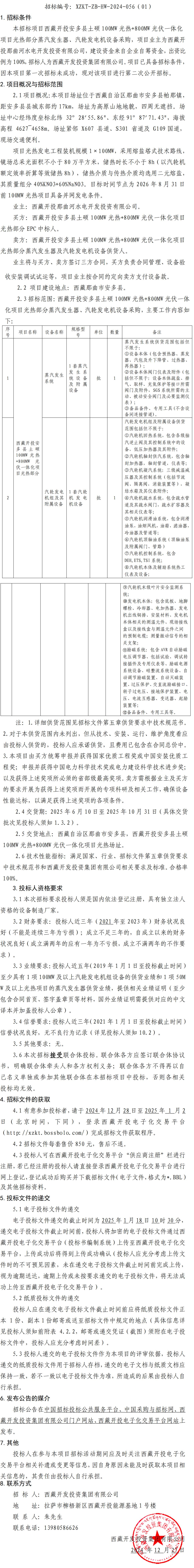 西藏開投安多縣土碩 100MW 光熱+800MW 光伏一體化項(xiàng)目光熱部分蒸汽發(fā)生器、汽輪發(fā)電機(jī)設(shè)備采購招標(biāo)(第二次)公告